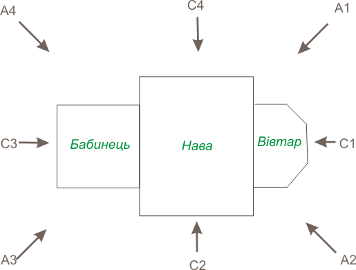 Храми часто орієнтовані вівтарями на схід. Їх фото ми підписуємо: «вигляд зі сходу»… «вигляд з південного заходу». Але досить часто храми орієнтовані вівтарями в інші боки; в таких випадках замість «вигляд з боку вівтаря» ми підписуємо «вигляд з позиції С1» та інших позицій – відносно орієнтації самої будівлі, а не сторін світу, як показано на рисунку.