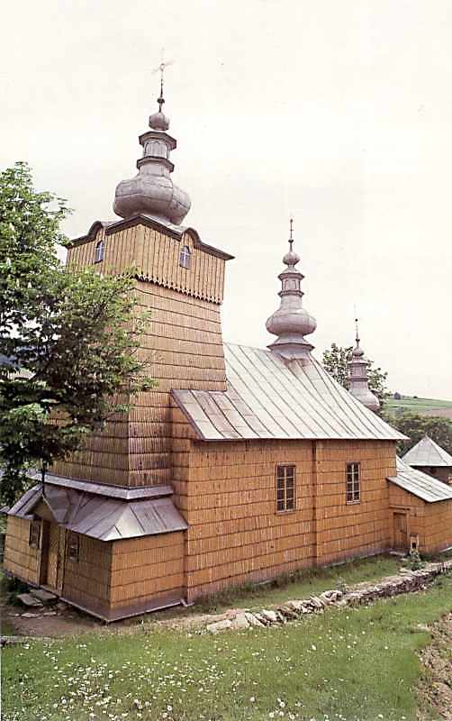 Cerkiew greckokatolicka pw. Swietych Kosmy i Damiana z XVIII w. (od 1947 r. kosciol rzymskokatolicki) w typie zachodniolemkowskiego budownictwa cerkiewnego. W 1898 r. swiatynie znacznie przeksztalcono. Cerkiew drewniana, konstrukcji zrebowej, pobita gontami, z izbicowa wieza o pochylych scianach, konstrukcji slupowej. W dolnej czesci wieze otacza zachata. Nawa w ksztalcie wydluzonego prostokata, prezbiterium zamkniete trojbocznie, przy nim zakrystia konstrukcji szkieletowej. Prezbiterium kryte dachem namiotowym, a nawa dachem dwuspadowym. W zwienczeniu wiezy i dachow trzy makowice z pozornymi latarniami, makowiczkami i krzyzami. Wyposazenie: ikonostas z 1787 r., oltarz ze scena Wniebowstapienia Matki Boskiej z XIX w., ikony duzej wartosci artystycznej z XVI i XVII w., carskie wrota z XVII w., obraz Sw. Michala Archaniola z 1702 r.