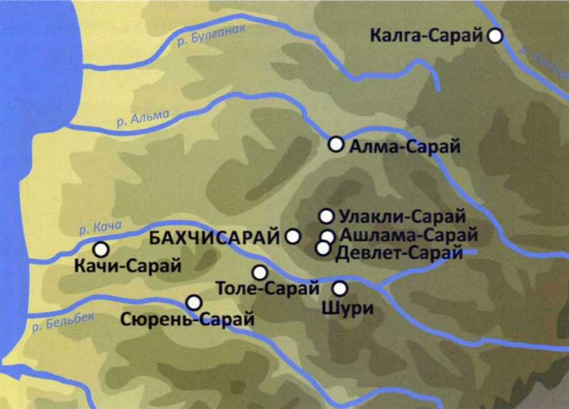Картосхема ханських палацівРозмір зображення: 800:575 піксел Схема приблизного розташування ханських палаців довкола Бахчисараю О. Гайворонського, 2017 р. [Гайворонський О. Країна Крим. – К.: Майстер книг, 2017 р., c. 213] |