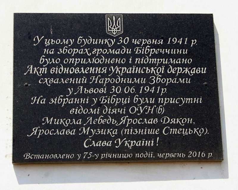 Напис: «У цьому будинку 30 червня 1941 р. на зборах громади Бібреччини було оприлюднено і підтримано Акт відновлення української держави, схвалений народними зборами у Львові 30.06.1941 р. На зібранні у Бібрці були присутні відому діячі ОУН(б) Микола Лебедь, Ярослав дякон, Ярослава Музика (Стецько). Слава Україні! Встановлено у 75-у річницю події, червень 2016 р.»