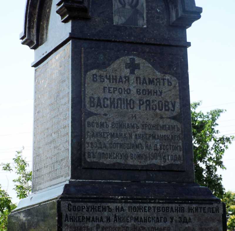 Напис: «Вечная память герою воину Василию Рябову и всем воинам уроженцам г. Аккермана и Аккерманского уезда, погибшим на Д. Востоке в японскую войну 1904/5 года.