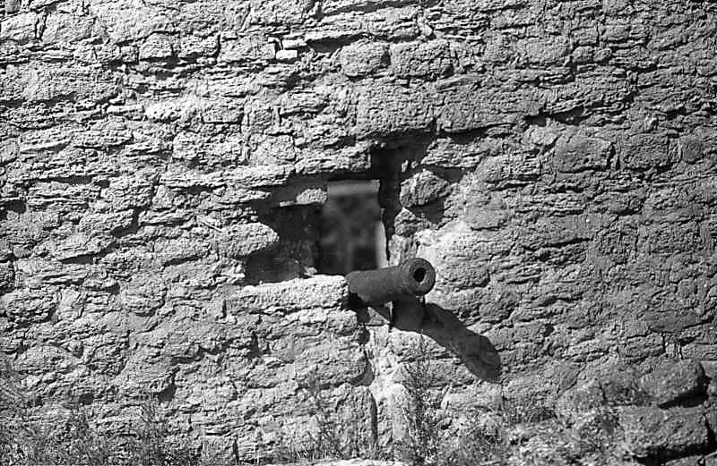 1987 р. Бійниця з гарматою між баштами 1 і 2. Вигляд зі сходуРозмір зображення: 800:521 піксел 1987 р. 27 серпня. Фото М.І.Жарких. Негатека, № 358-31. |