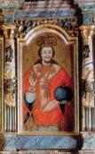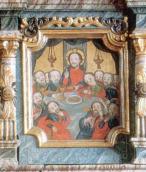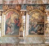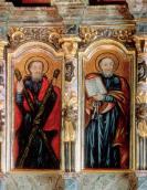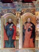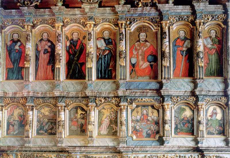 Апостольський і празниковий ряди іконостасу Розмір зображення: 800:549 піксел Вкладені елементи Два апостоли з лівої сторони Апостоли Андрій та Петро Христос Пантократор Апостоли Павло та [невідомий мені] Благовіщення та Різдво Христове Стрітення та Хрещення Тайна вечеря В’їзд до Єрусалиму та Преображення
