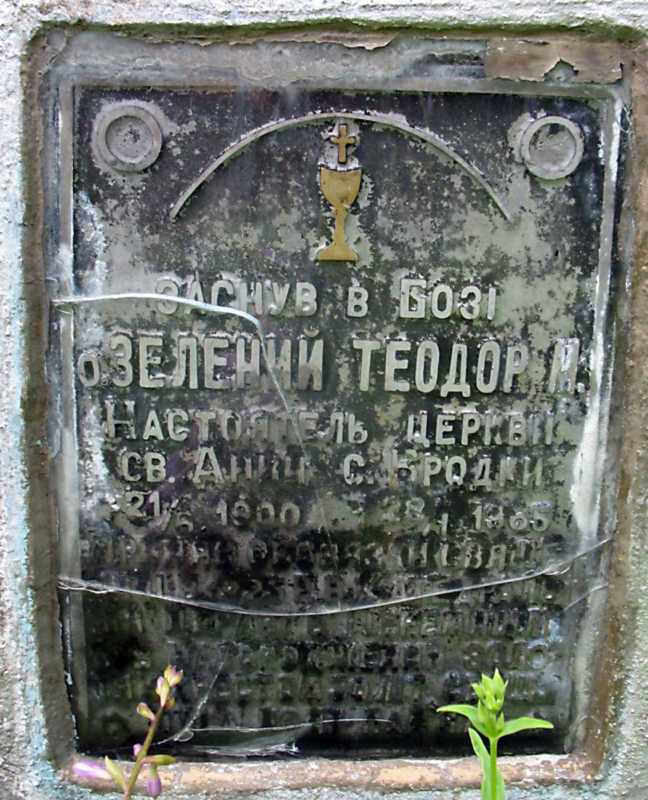 Напис: «Заснув у бозі о. Зелений Теодор М. настоятель церкви св. Анни с. Бродки21.06-1600 – 28.01.1965 [делі некст не читається]».