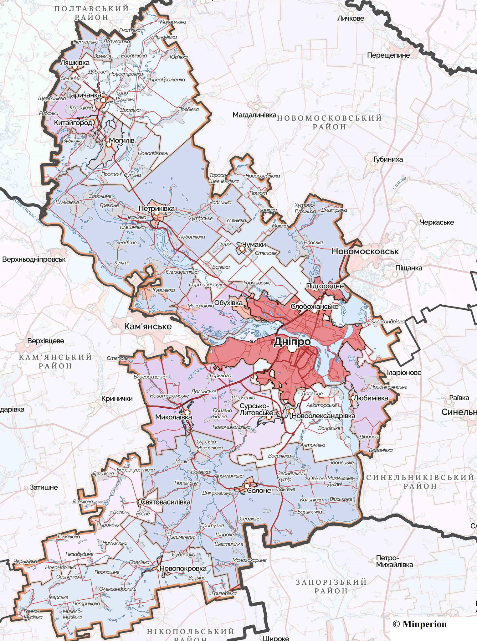 Район утворено постановою Верховної Ради України від 17 липня 2020 р. «Про утворення та ліквідацію районів» (з адміністративним центром у місті Дніпро) у складі територій Дніпровської міської, Китайгородської сільської, Любимівської сільської, Ляшківської сільської, Миколаївської сільської, Могилівської сільської, Новоолександрівської сільської, Новопокровської селищної, Обухівської селищної, Петриківської селищної, Підгородненської міської, Святовасилівської сільської, Слобожанської селищної, Солонянської селищної, Сурсько-Литовської сільської, Царичанської селищної, Чумаківської сільської територіальних громад, затверджених Кабінетом Міністрів України.