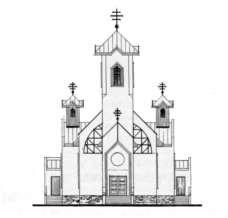 Проект головного фасаду нової церквиРозмір зображення: 800:768 піксел Довге Поле. План греко-католицької церкви. Архітектор А. Медвецький. Джерело: Сирохман М. Церкви України: Закарпаття. – Льв.: 2000 р., с. 33. |