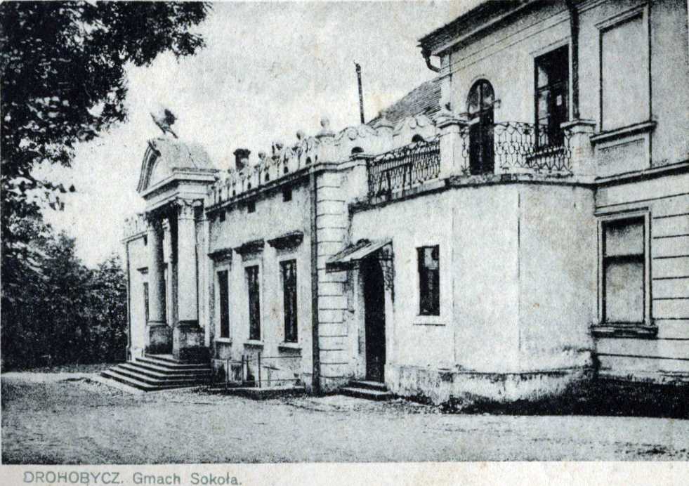 Поштівка: будинок польського спортивного товариства «Сокіл» у Дрогобичі. Drohobycz, gmach Sokoła. – [S.l.] : Wyd. Polskiego Towarzystwa Księgarni kolejowych «Ruch» S. A., [ca 1925] (Kraków : Zakład Reprodukcyjny «Akropol») (pocztówka); 9 × 13 cm