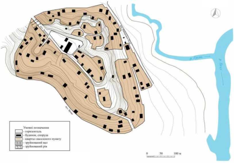 Городище в ур. ЗамокРозмір зображення: 814:568 піксел План городища в Галячі Із книги: Осадчий Є. М. Літописні міста Південної Сіверщини. – Харків: 2023 р., с. 242. |