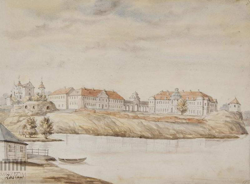 Kościół misjonarzy p.w. św. Józefa i pałac Sanguszków dawniej Zasławskich. Widok ogólny od strony rzeki Horyń. W głębi kościół z transeptem i dwiema wolnostojącymi wieżami; obok zespół pałacowy, wokół którego pozostałości murów obronnych; pałac dwukondygnacjowy a wielobocznym, zwieńczonym kopułą ryzalitem środkowym z portykiem kolumnowym oraz ryzalitami bocznymi zwieńczonymi półowalnymi przyczółkami; z lewej drugi pałac dwukondygnacjowy z ryzalitem; oba budynki połączone arkadową galerią- bramą. Napis: Zasław – zamek, – widok ogólny Wołyń. 1872. Rys. ołówkiem podmalowany akwarelą. 20,5 x 27,9 cm. Muzem Narodowe, Kraków. III-r.a. 4293 (Teka Wołyń). [Katalog rysunków architektonicznych ze zbiorów Muzeum narodowego w Krakowie. 1. Rysunki Napoleona Ordy / Opracowały Zofia Kucielska i Zofia Tobiaszowa. – Warszawa: Państwowe wydawnictwo naukowe, 1975, Nr. 862]