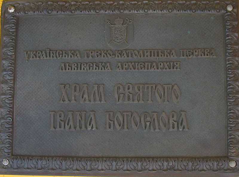 Напис: «Українська греко-католицька церква. Львівська архієпархія. Храм святого Іоана Богослова» .