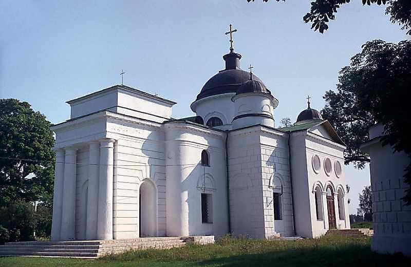Георгиевская церковь, 1817-1828 гг. Сооружена в стиле ампир, из кирпича, оштукатурена и побелена, В плане крестообразная с вытянутой западной ветвью и примыкающей к ней колокольней, с полукруглой апсидой и угловыми прямоугольными в плане камерами, равными по высоте основному объему. Западный вход акцентирован четырехколонным дорическим портиком со спаренными колоннами, несущими антаблемент с триглифами по фризу. Утрачены северный и южный портики церкви и два верхних яруса колокольни. Фасады колокольни и угловых камер рустованы. Проемы прямоугольные и полуциркульные, декорированные пилястрами, сандриками, архивольтами. Центральное помещение памятника перекрыто куполом, в западной части – хоры, на которые ведут винтовые лестницы в толще западной стены, ветви перекрыты полуциркульными сводами. Над апсидой – конха.