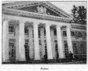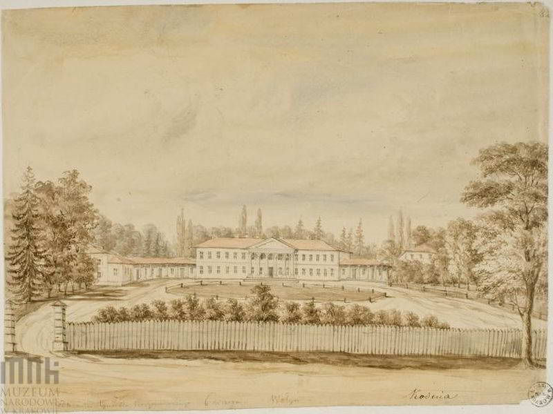 Pałać Korzeniowskich. Widok od strony podjazdu. Pałac dwukondygnacjowy z portykiem kolumnowym w wielkim porządku, dwiema ćwierćkolistymi galeriami i oficyną z lewej strony. 1862 – 1876. Dat.: 6 Września. Napis: Kodnia – Generała Korzeniowskiego; Wołyń; Kodnia; napis na podkładzie: G. Wołyńska Kodnia. Rys. ołówkiem podmalowany akwarelą i sepią, 19,7x26,4. III-r.a. 4172 (Teka Wołyń). Bibl.: Ross, Kilka uwag o genezie, s. 228, ii. 9; Jaroszewski, O dwóch grupach polskich rezydencji, ii. 31. [Katalog rysunków architektonicznych ze zbiorów Muzeum narodowego w Krakowie. 1. Rysunki Napoleona Ordy / Opracowały Zofia Kucielska i Zofia Tobiaszowa. – Warszawa: Państwowe wydawnictwo naukowe, 1975, Nr. 318]