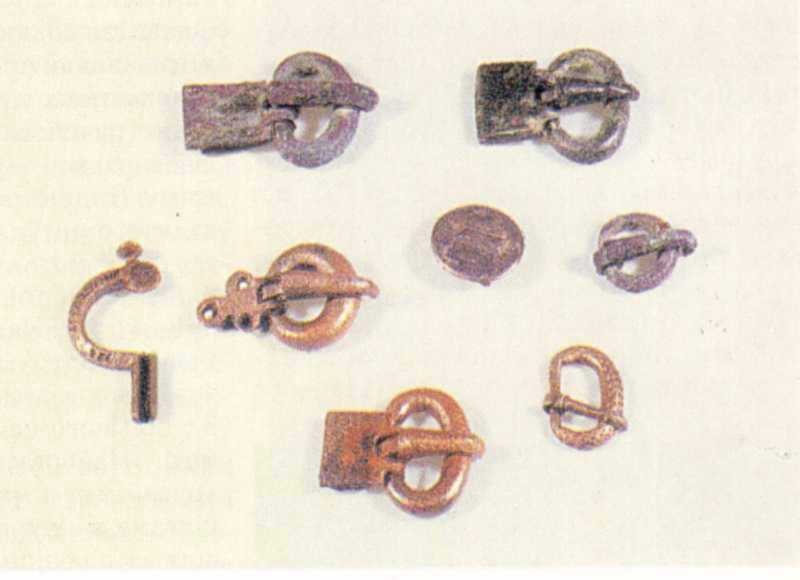 Пряжки і фібула черняхівської культури (IV ст., с. Косанове Вінницької обл.). Джерело: Історія української культури. – К.: 2001 р., т. 1, с. 617.