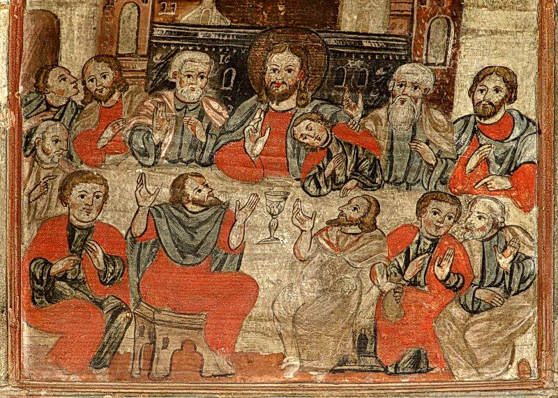 Тайна вечеряРозмір зображення: 800:571 піксел Тайна вечеря. Клеймо ікони «Страсті Христові» 1737 р. З церкви св.Кузьми і Дем'яна у Котані. Нині в музеї-замку Ланцуті. |