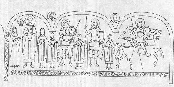 Схема-реконструкция росписи западной и северной стен храма «Донаторов» (развертка). Автор И. Г. Волконская (2002 г.). По рисунку, опубликованному в статье И. Г. Волконской «Фрески пещерных храмов Эски-Кермена и его округи (Юго-Западный Крым)» [Волконская, 2003, рис. 7]