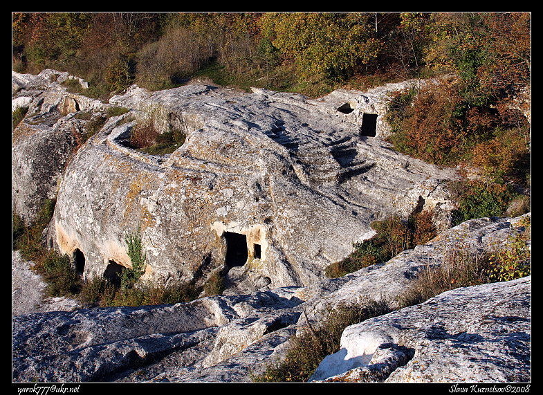 Вирубки в скелі й печери біля східного краю платоРозмір зображення: 785:571 піксел Фото: Ярослав Кузнецов, 9 листопада 2008 р.