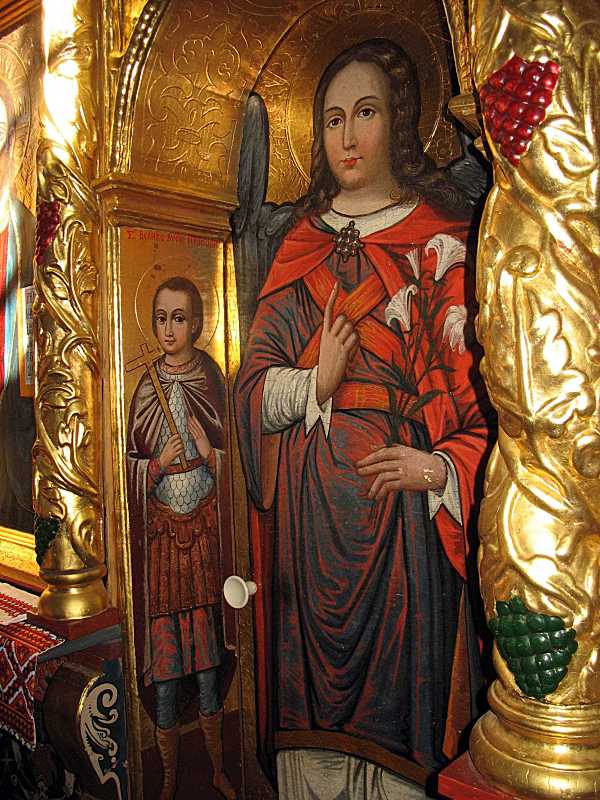 2008 р. Ікони «Св. Прокопій» та «Архангел Гавриїл»Розмір зображення: 600:800 піксел «Св. великомученик Прокопій» – на лівому відкосі врат. Фото Зенона Боровця і Богдана Тхора, 11 серпня 2008 р. |