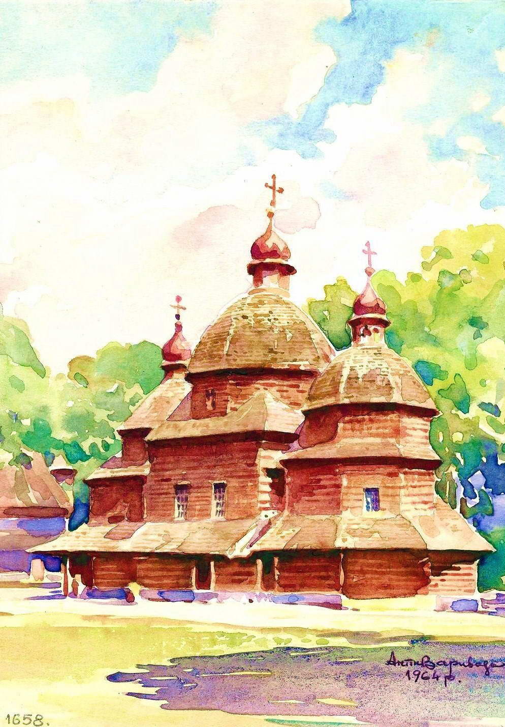 1964 р. Загальний вигляд з позиції А2Розмір зображення: 994:1429 піксел Рисунок Антона Вариводи (Краків), 1964 р. 1658 Church, Krekhiv, Lviv, Ukraine. Southwestern view. |