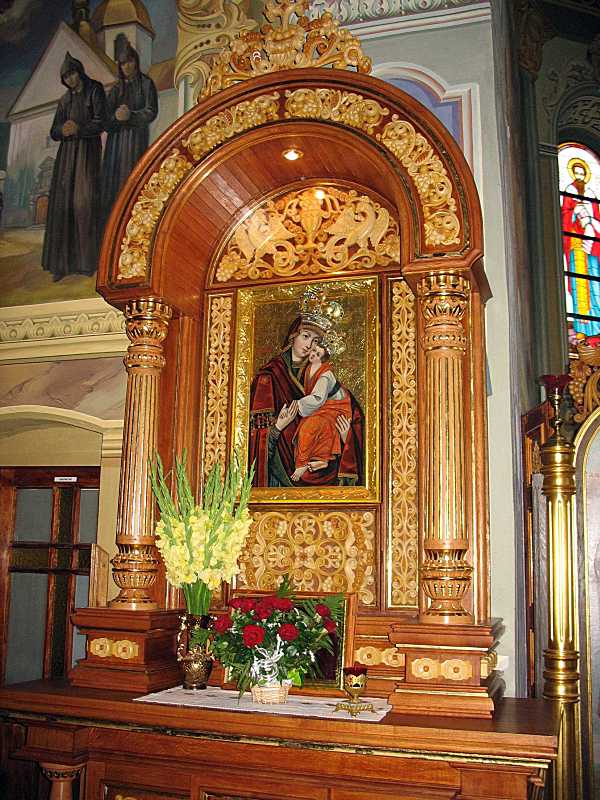 Кіот з іконою богородиці замилуванняРозмір зображення: 600:800 піксел Кіот розміщено при західній площині північно-східного підкупольного стовпа. Фото Зенона Боровця і Богдана Тхора, 20 серпня 2006 р. |