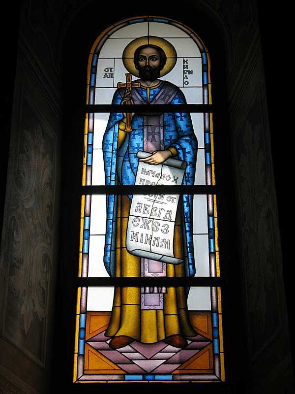 Вітраж «Св. апостол Кирило»Розмір зображення: 600:800 піксел Фото Зенона Боровця і Богдана Тхора, 8 липня 2007 р. |