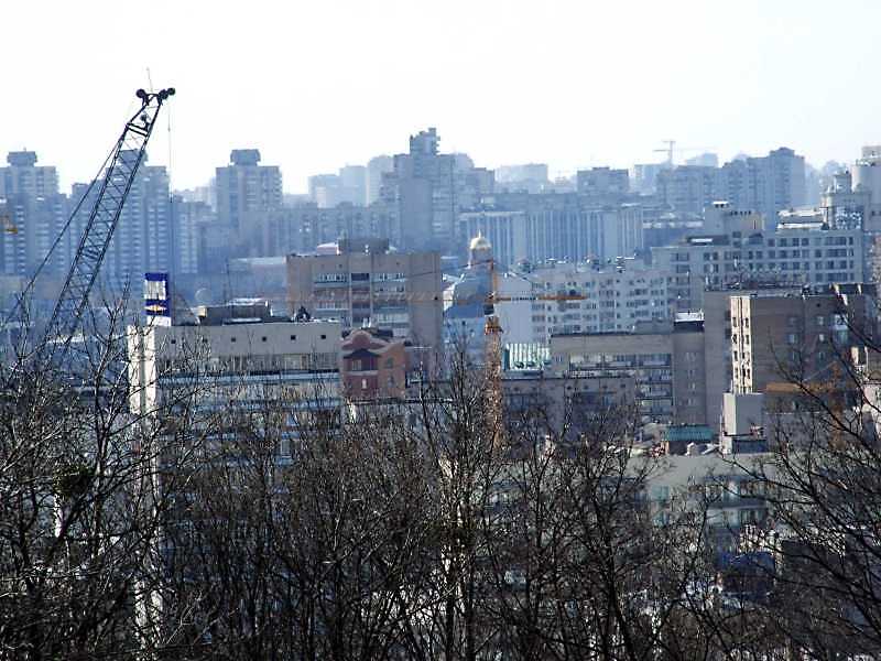 Вид з валу Госпітального укріплення Київської фортеці на захід. В центрі – золотий купол церкви св.Георгія біля залізничного вокзалу. 2 квітня 2009 р. Фото М.І.Жарких.