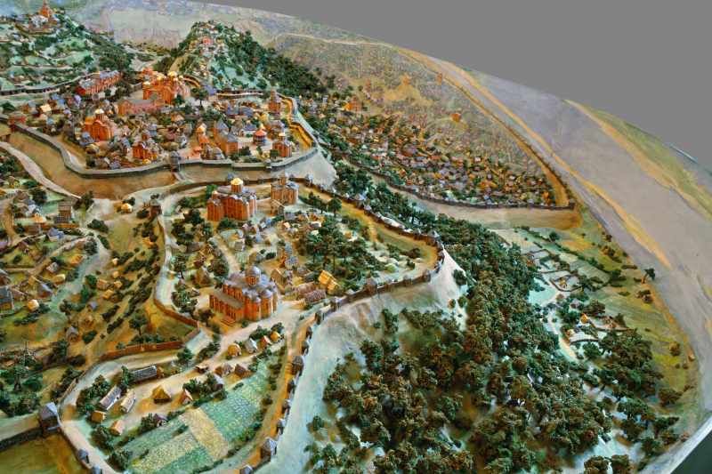 Вигляд з південного сходу (2)Розмір зображення: 800:533 піксел На передньому плані – город Ізяслава, далі за ним – город Володимира; лівому верхноьму куті – Копирів кінець; справа видно Поділ. |