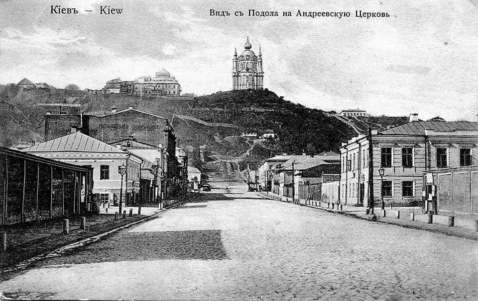 Кін. 19 ст. (?) Перспектива на Андріївську церквуРозмір зображення: 960:606 піксел Фото опублікував Олег Заварзін 25.02.2020 р. Двоповерховий будинок праворуч – готель «Московський» (вул. Братська 7 / Андріївська 11). |