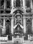 На темно-червоному тлі іконостаса, який є головним акцентом в інтер’єрі, яскраво виділяються позолочене різьблення та скульптура. Ікони належать пензлю художника О.Антропова та українських митців Г. та Д.Левицьких. Пізніші малювання виконані П.Бориспольцем та невідомим автором.