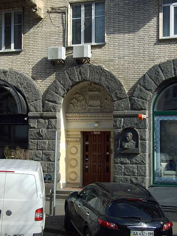 Вхід Розмір зображення: 600:800 піксел Фото М. І. Жарких, 12 березня 2020 р. Вкладені елементи Рельєфний тимпан із датою 1951 р. Меморіальна дошка В. Комісаренку (+)