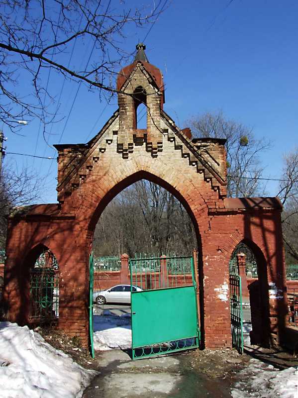 БрамаРозмір зображення: 599:800 піксел Загальний вигляд з півдня. За брамою – вул. Байкова і Новий цвинтар. 9 квітня 2013 р. Фото М.І.Жарких. |