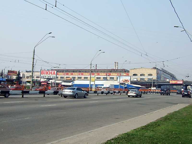 2009 р. Шляхопровід вул. В.Гетьмана над проспектом ПеремогиРозмір зображення: 800:600 піксел На тлі корпусів заводу “Більшовик”. Вигляд зі сходу. 17 квітня 2009 р. Фото М.І.Жарких. |