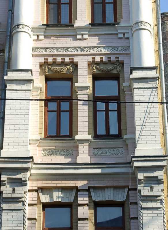 Вікна 3-го поверху Розмір зображення: 583:800 піксел Фото М. І. Жарких, 27 березня 2021 р. Вкладені елементи Рельєфна вставка над вікном 3-го поверху