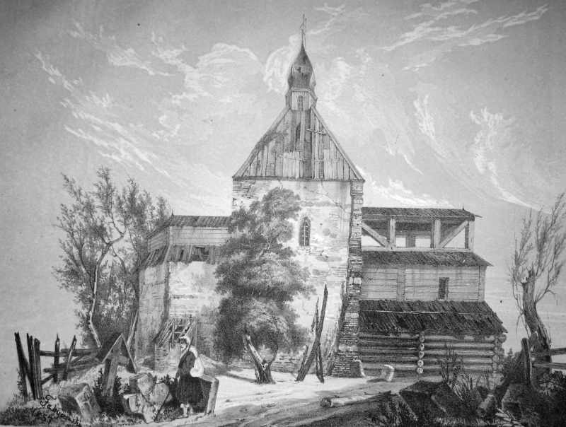 Вид церкви, збудованої митрополитом Петром Могилою на руїнах Десятинної. У літографії А.Гаммершміда.