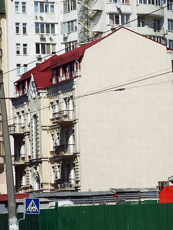 Житловий будинок (№ 44б) Розмір зображення: 600:800 піксел 9 квітня 2009 р. Фото М.І.Жарких. Вкладені елементи Головний фасад у ракурсі
