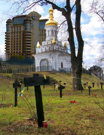 На переднем плане – заложенный Президентом В. Ющенко мемориальный комплекс жертвам голодомора «Калиновий гай», за ним церковь Андрея Первозванного. На заднем плане – 18-ти этажный дом, строительство которого началось на месте разрушенного в 1934 году Военно-Никольского собора.