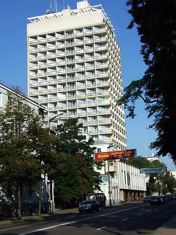 Готель “Київ” (№ 26 / Липська, 1) Розмір зображення: 600:800 піксел Вкладені елементи 1975 р. Парк перед Маріїнським палацом з видом на готель “Київ” 2007 р. Загальний вигляд у перспективі вул. Грушевського 2007 р. Прикраса фасаду по вул.Грушевського
