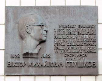 1983 на фасаді будинку встановлено бронзову меморіальну дошку з барельєфним портретом В. Глушкова (ск. В. Клоков, худ. Ф. Юр’єв).
