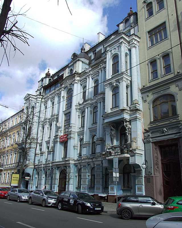 2020 р. Загальний вигляд з півдня Розмір зображення: 639:800 піксел Фото М. І. Жарких, 15 березня 2020 р. Вкладені елементи Вікно 3-го поверху Вікно 4-го поверху Вікна і балкон 1-2-го поверхів Вікна 2-4-го поверхів Сходова клітка (2 – 4-й поверхи) Вхід Вікно 4-го поверху правого еркреа Вікно 3-го поверху правого еркреа Правий вхід (1-2-й поверхи) (+)