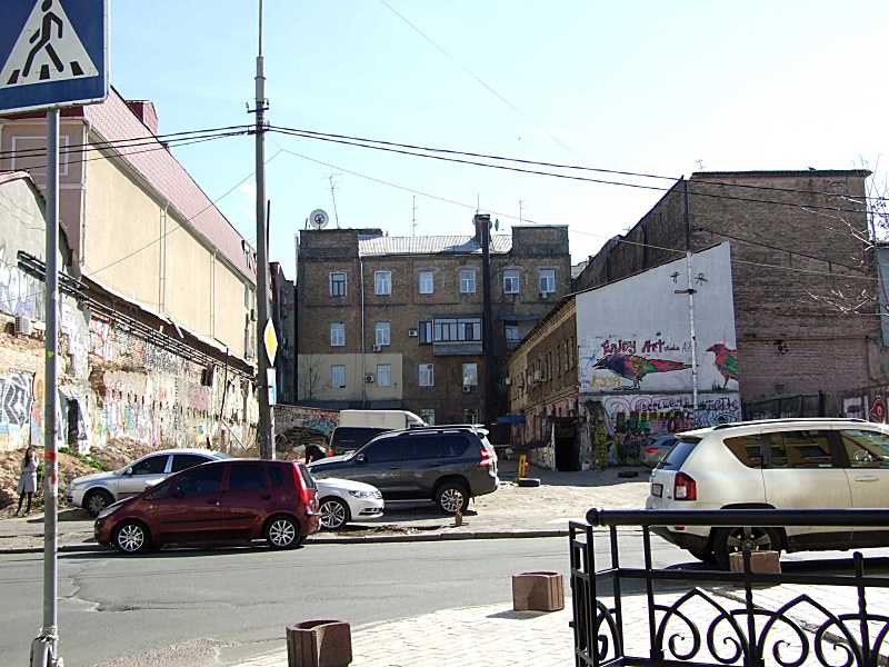 Місце будинку № 4Розмір зображення: 800:600 піксел Праворуч зберігся ще флігель давнього будинку (№ 4б), витягнутий в глибину двора (до нас звернений брандмауером). Фото М. І. Жарких, 16 березня 2020 р. |