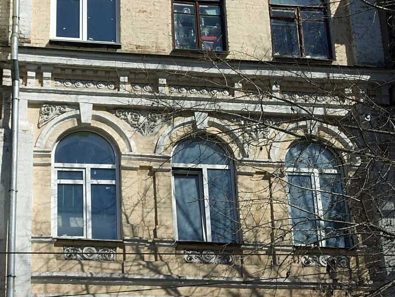 Вікна 3-го поверху (2) Розмір зображення: 800:601 піксел Фото М. І. Жарких, 16 березня 2020 р. Вкладені елементи Карниз над вікном 3-го поверху
