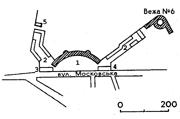 Первісний генеральний планРозмір зображення: 626:417 піксел 1 – казарма 2 – стайні 3 – манеж 4 – кінський лазарет 5 – кордегардія Джерело: Звід пам’яток історії і культури України. – К.: 1999 р., т. 1 (Київ), с. 448. |