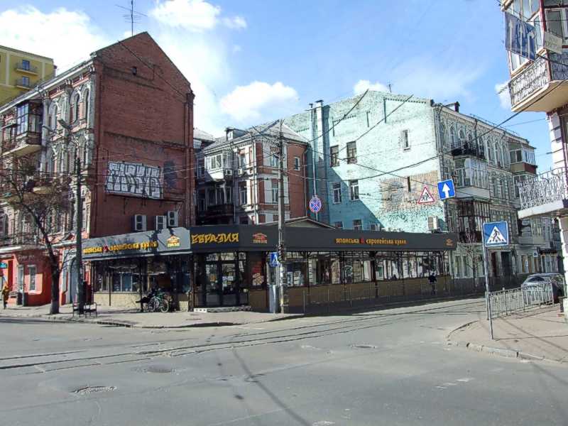 Ліворуч – вул. Нижній Вал, праворуч – вул. Межигірська. Фото М. І. Жарких, 23 березня 2021 р.