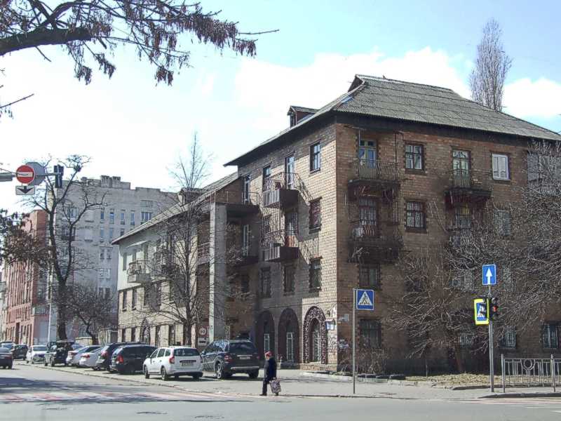 Житловий будинок (№ 21)Розмір зображення: 800:600 піксел Вигляд зі сходу. Ліворуч – вул. Оболонська, праворуч – вул. Межигірська. Фото М. І. Жарких, 24 березня 2021 р. |
