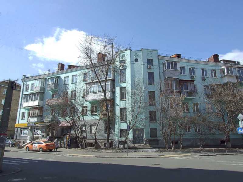 Житловий будинок (№ 35)Розмір зображення: 800:600 піксел Вигляд з південного сходу. Ліворуч – вул. Оболонська, і праворуч – теж вул. Оболонська (це вона так повертає в цьому місці). Фото М. І. Жарких, 24 березня 2021 р. |