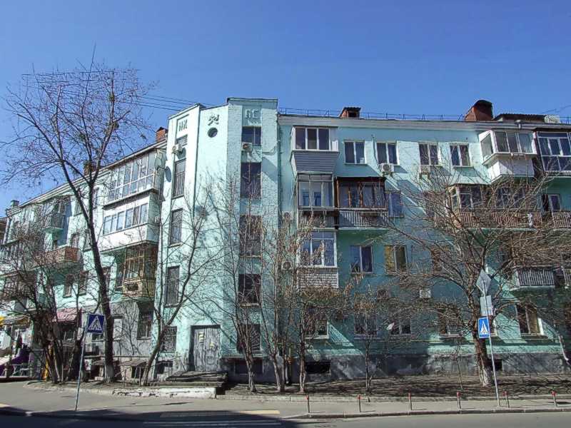 2021 р. Загальний вигляд зі сходуРозмір зображення: 800:600 піксел Фото М. І. Жарких, 26 березня 2021 р. На верхньому поверсі наріжної частини – літери НК ПС, тобто «Нарокомат путей сообщения». |