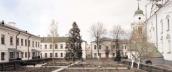 Паралельну вісь головного простору на заході замикає класицистична ротонда з прилеглими обабіч призматичними об’ємами-крилами церкви Воскресіння Ісуса Христа на схилі гори. Інша композиційно-планувальна вісь північ – південь перетинає садибу та планувально поєднує другорядні входи в монастир з прилеглих міських просторів. На монастирській вулицї, сформованій переважно двоповерховими житловими корпусами в стилі класицизм, – увінчана банею апсида церкви Святих мучеників Флора і Лавра. Композиційним центром архітектурного ансамблю та його висотною домінантою є собор Вознесіння Господнього, навколо якого розміщено одно-, двоповерхові житлові споруди у стилі класицизм.