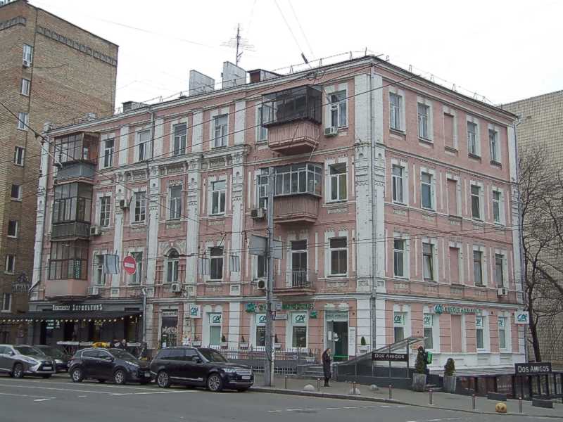 2021 р. Загальний вигляд з північного заходу (2)Розмір зображення: 800:600 піксел Ліворуч – вул.Саксаганського, праворуч – вул.Володимирська. Фото М. І. Жарких, 29 березня 2021 р. |