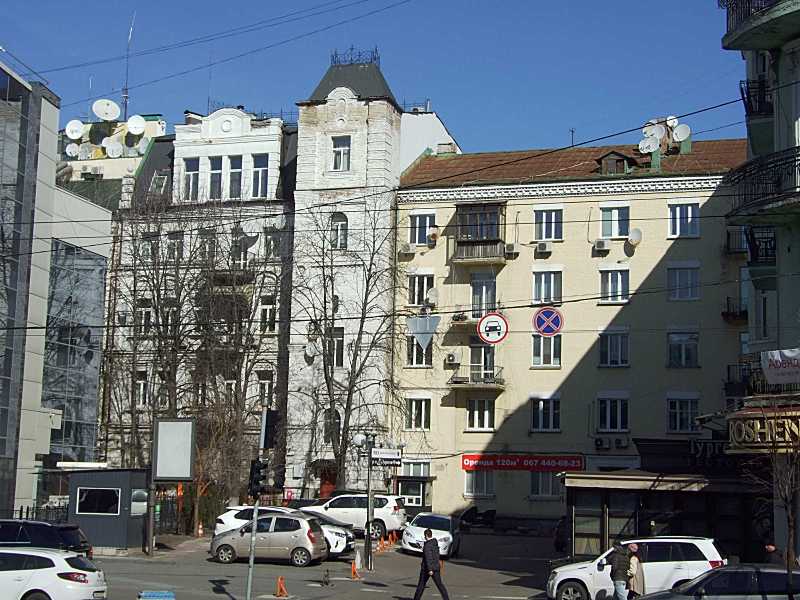 2020 р. Будинки № 4, 4а Розмір зображення: 800:600 піксел Фото М. І. Жарких, 16 березня 2020 р. Вкладені елементи Фронтон і вікно 6-го поверху сходової клітки