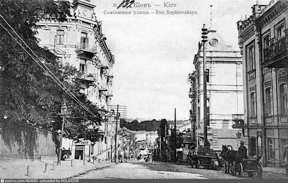 1890..1915 рр. Перспектива від Михайлівського пров. на східРозмір зображення: 960:611 піксел Поштівку 1890..1915 рр. опублікував Олег Заварзін 8.12.2019 р. , також . Ліворуч – будинок № 14, праворуч – № 17 по Софійській вул. |