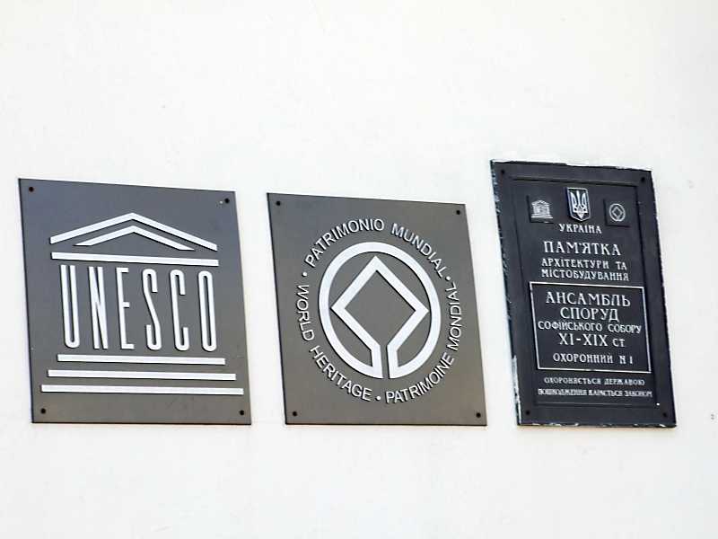 Дошки знаходяться ліворуч від дзвіниці. На першій написано: UNESCO. Друга – знак об’єкту всесвітньої спадщини. Третя – охоронна дошка пам’ятки України. 19 березня 2012 р. Фото М.І.Жарких.